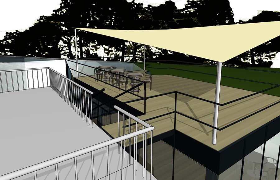 Die Terrasse auf dem Dach des Neubaus eröffnet den Ausblick auf Eisenstadt. sie liegt genau auf der Höhe des Stufenpodestes der Freitreppe und ist von dort über eine Brücke erreichbar, in die auch ein vom neuen Verbindungsgang kommender Steg einmündet, der eine direkte Verbindung zum darunterliegeneden Raum ermöglicht.